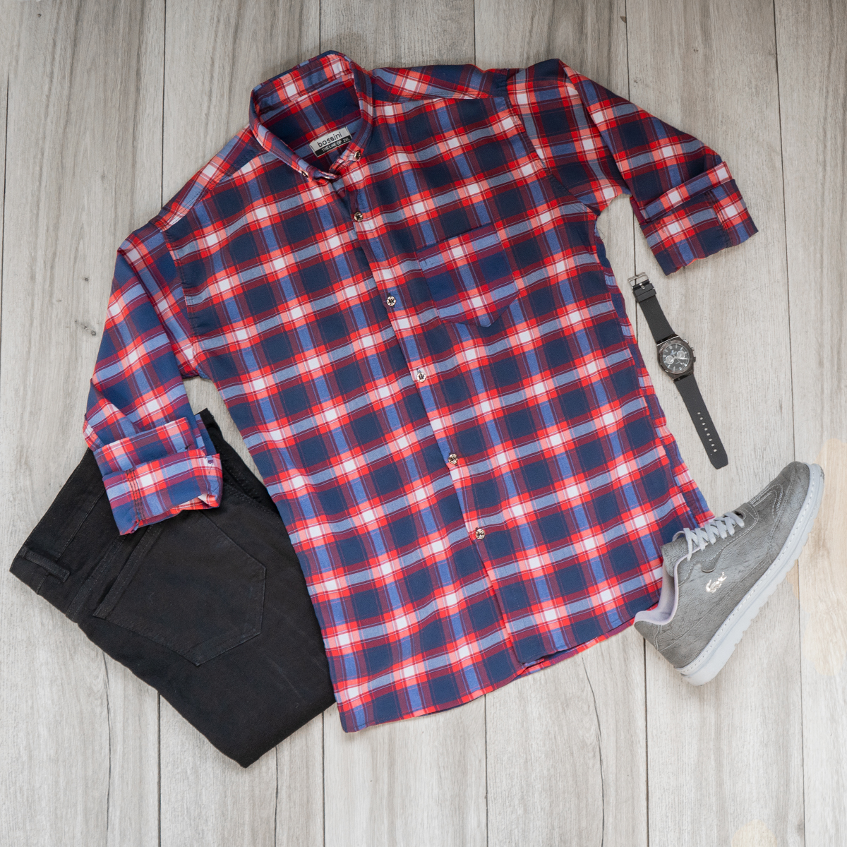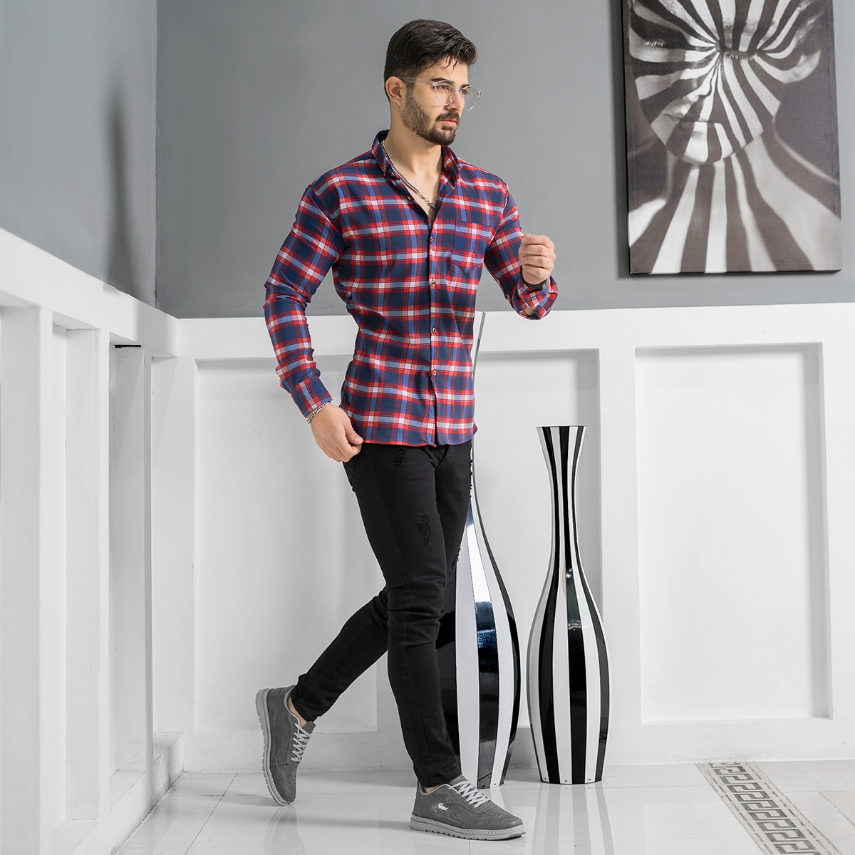 پیراهن مردانه چهارخونه سرمه ای قرمز مدل Tivon
