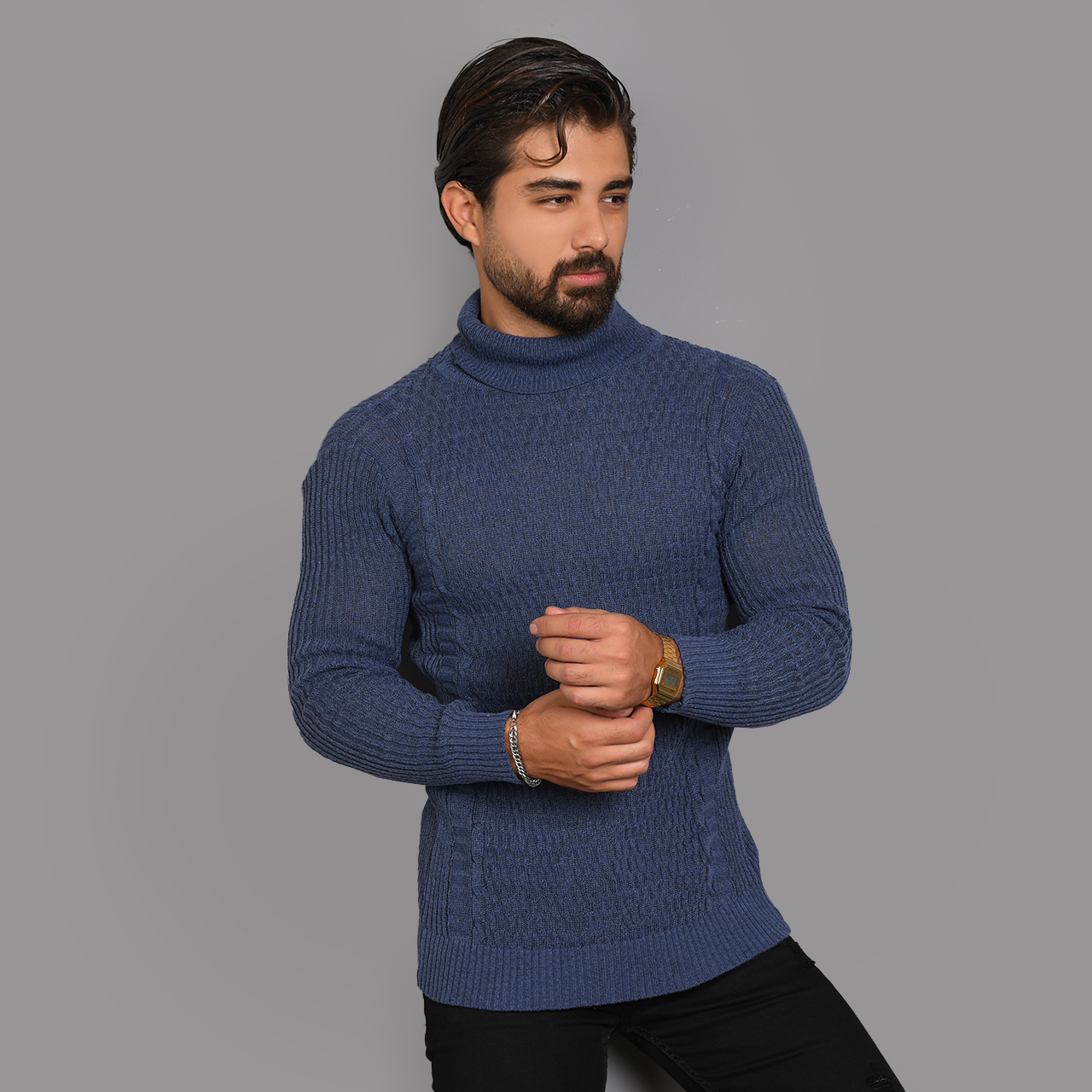 پلیور یقه اسکی آبی طرح راه راه مردانه مدلT10
